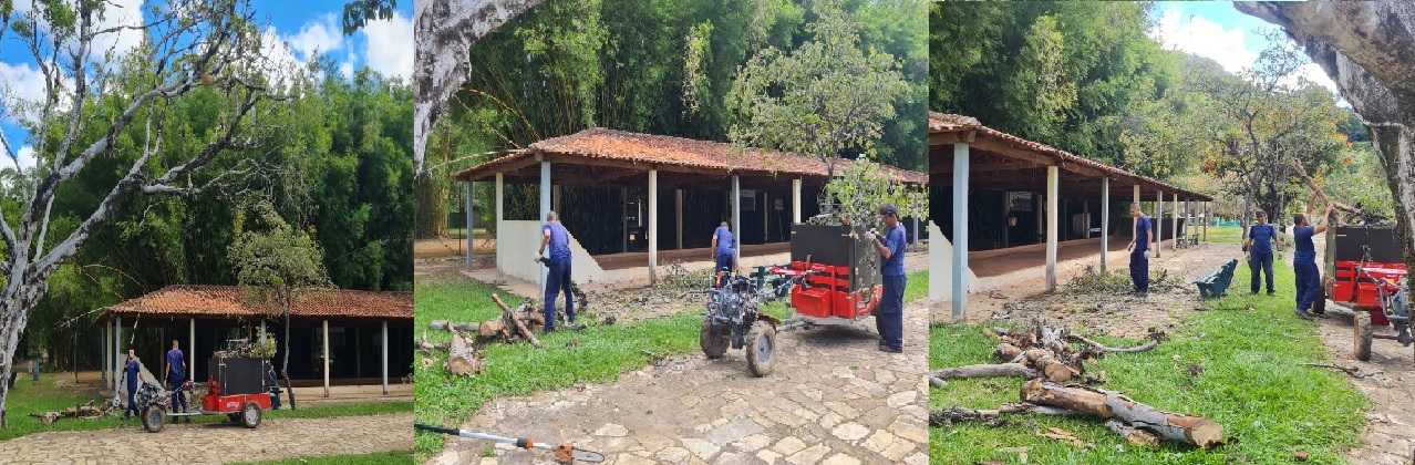 Funcionários do Parque das Águas fazendo a manutenção da quadra de bocha. A poda de alguns galhos de árvore foi necessária para evitar danos ao telhado da quadra, assim como outros reparos nas telhas e melhorias na parte elétrica.
