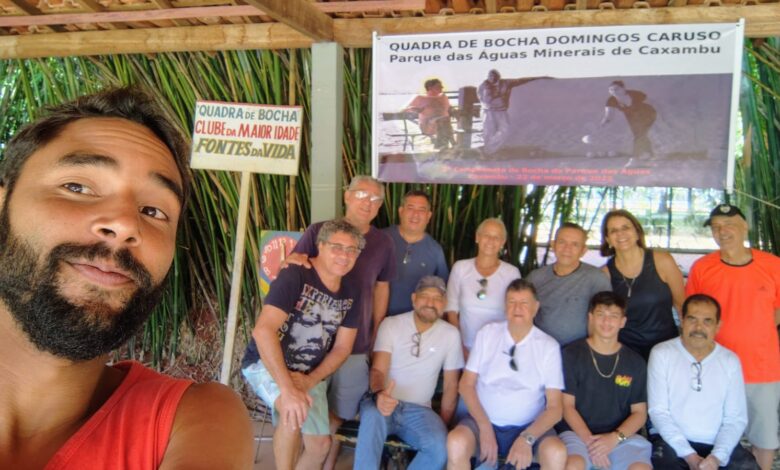 Os jogadores de bocha de São Lourenço com os frequentadores da Quadra de Bocha Domingos Caruso, em Caxambu