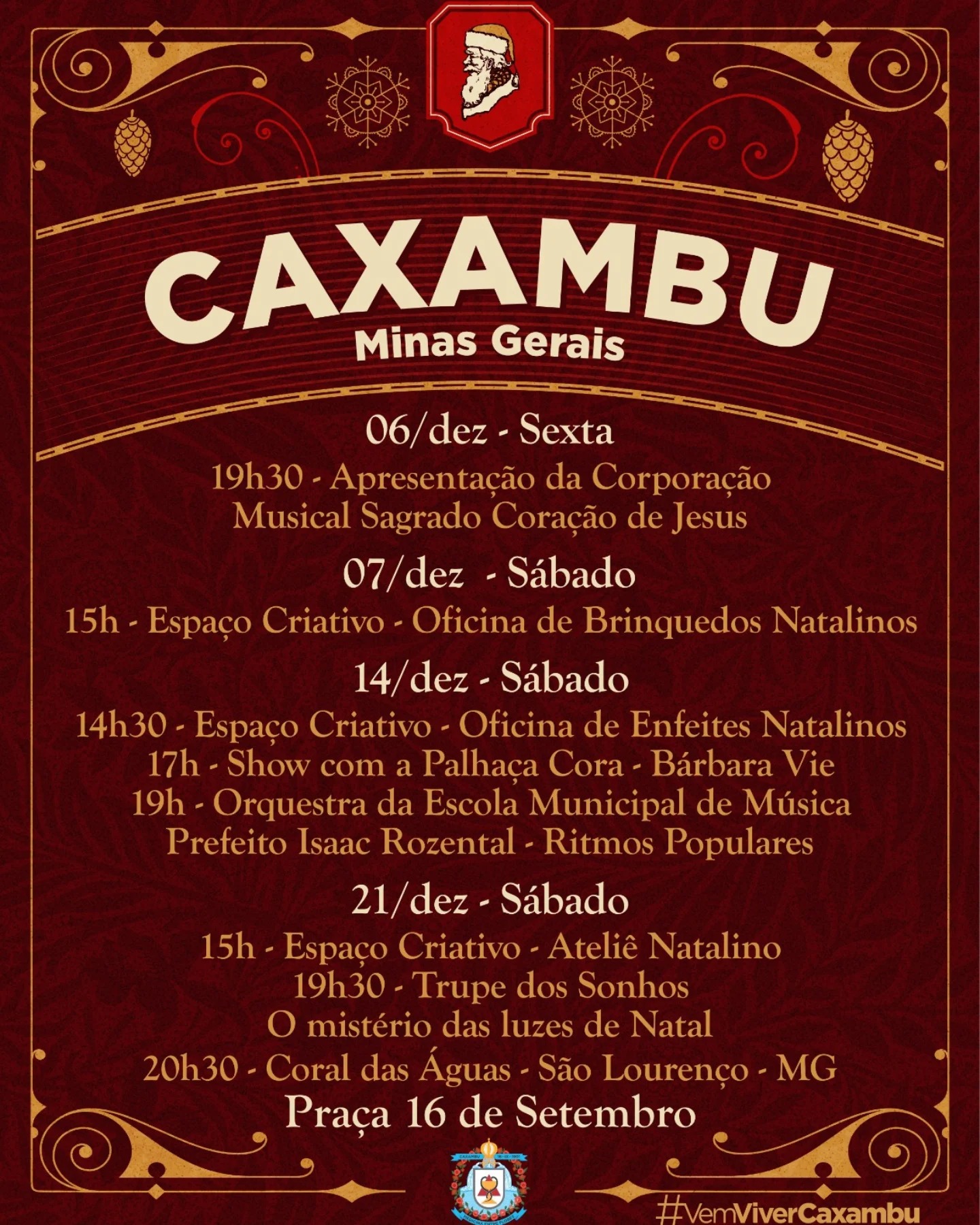 – As atividades ocorrerão no Parque das Águas, Praça João Lage, Igreja Matriz e Praça da Estação. Todas as ações são gratuitas e a programação completa pode ser acessada no site www.nataldasaguas.com.br.
