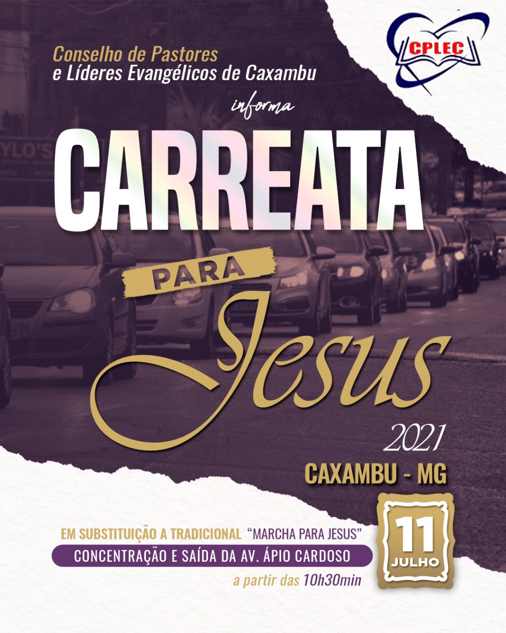 O Conselho de Pastores e Líderes Evangélicos de Caxambu informa que no dia 11 de Julho de 2021 a partir das 10:30 será realizada a CARREATA PARA JESUS 2021 (em substituição a tradicional “Marcha para Jesus”), com a concentração e saída da Av. Ápio Cardoso.