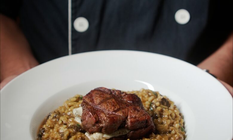 Preparo: Risoto de café c/ funghi tornedor de mignon recheado com queijo Minas flambado na cachaça.