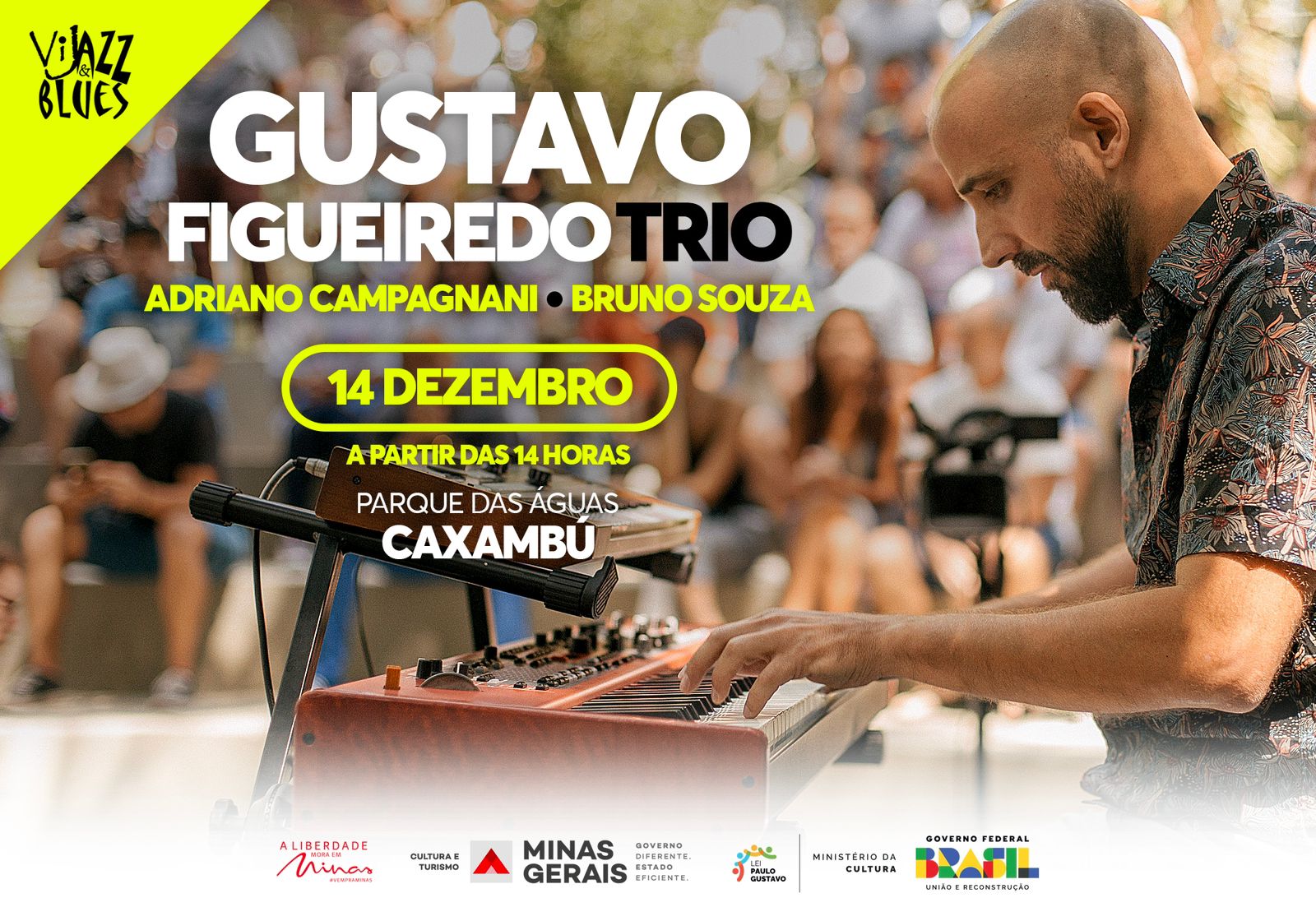 No dia 14 de dezembro, a partir das 14h, ‘Gustavo Figueiredo Trio’ se apresenta no Parque das Águas de Caxambu, na cidade de Caxambu/MG, como parte da programação do Circuito ViJazz & Blues Festival. O trio, liderado por Gustavo Figueiredo no piano, conta também com Adriano Campagnani no baixo e Bruno Souza na bateria. A proposta do grupo é misturar elementos e ritmos brasileiros tradicionais com uma linguagem jazzística contemporânea.