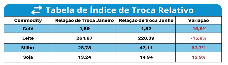 Conforme o quadro 1, café e leite obtiveram um resultado positivo nos seus índices de troca, em ambos os casos devido ao aumento do preço das commodities e à diminuição ponderada nos preços dos insumos. Portanto, é necessária uma menor quantidade de sacas ou litros para adquirir o conjunto de insumos necessários para seus processos produtivos, o que favorece o produtor rural.